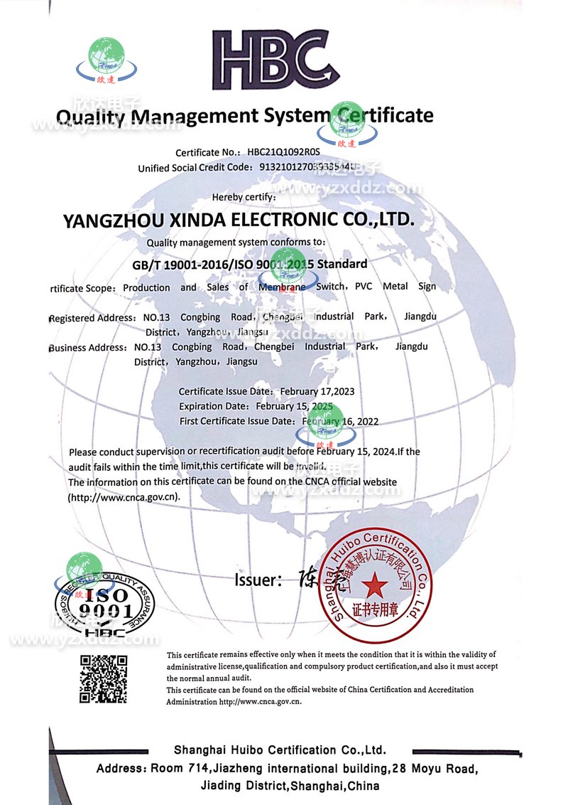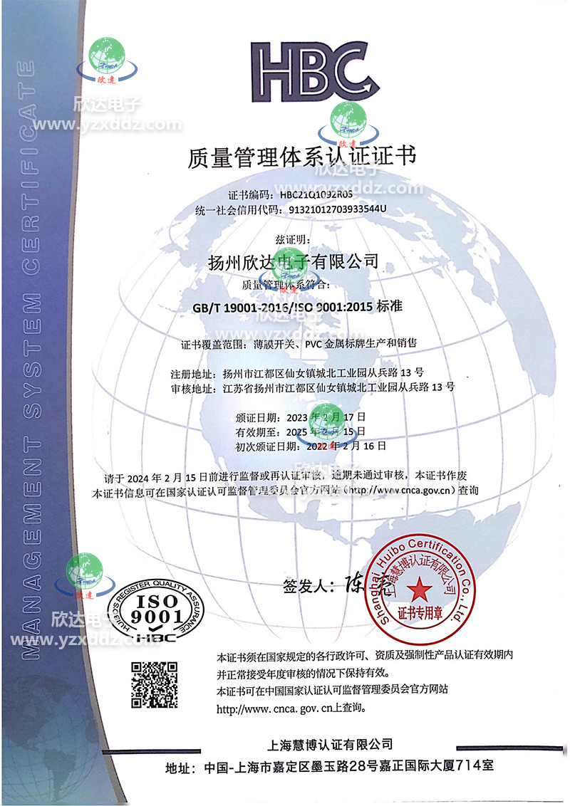 揚(yáng)州欣達(dá)電子有限公司是一家從事電子輕觸薄膜開(kāi)關(guān),薄膜面板及PVC、金屬標(biāo)牌,不干膠貼,噴塑、烤漆絲印面板等各種絲印工藝的有限責(zé)任公司。公司位于風(fēng)景秀麗的文化名城江蘇揚(yáng)州市江都區(qū)。自1993年建廠(chǎng)以來(lái),我們致力于信譽(yù)至上,顧客為首的原則,及時(shí)為廣大客戶(hù)提供合格滿(mǎn)意的產(chǎn)品:堅(jiān)持著質(zhì)量為首,持續(xù)改進(jìn)的方針,狠抓品質(zhì)管理,取得了客戶(hù)的認(rèn)可:履行著誠(chéng)信、互惠的宗旨,贏(yíng)得了客戶(hù)的支持和信任。目前公司擁有先進(jìn)的絲網(wǎng)印刷設(shè)備,熟練的業(yè)務(wù)技術(shù)骨干和嶄新適用的廠(chǎng)房,每年為全國(guó)各地的客戶(hù)提供數(shù)億的合格產(chǎn)品。我們把“誠(chéng)信、務(wù)實(shí)、求精、創(chuàng)新”作為我們的企業(yè)宗旨,在經(jīng)營(yíng)管理中貫徹“以人為本,精益求精”的經(jīng)營(yíng)理念;在生產(chǎn)管理中嚴(yán)格按ISO9001質(zhì)量體系落實(shí)生產(chǎn); 在為客戶(hù)服務(wù)過(guò)程中按照產(chǎn)品的分類(lèi)提供多種設(shè)計(jì)方案,讓我們產(chǎn)品更好體現(xiàn)客戶(hù)的理念。...