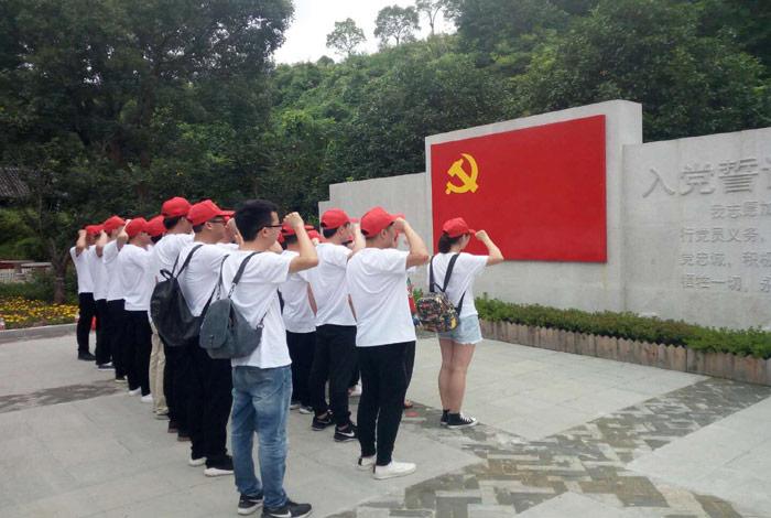 出陳列館,黨員們來到莊嚴的黨旗前,全體黨員肅立,高舉右拳,重溫入黨誓詞。