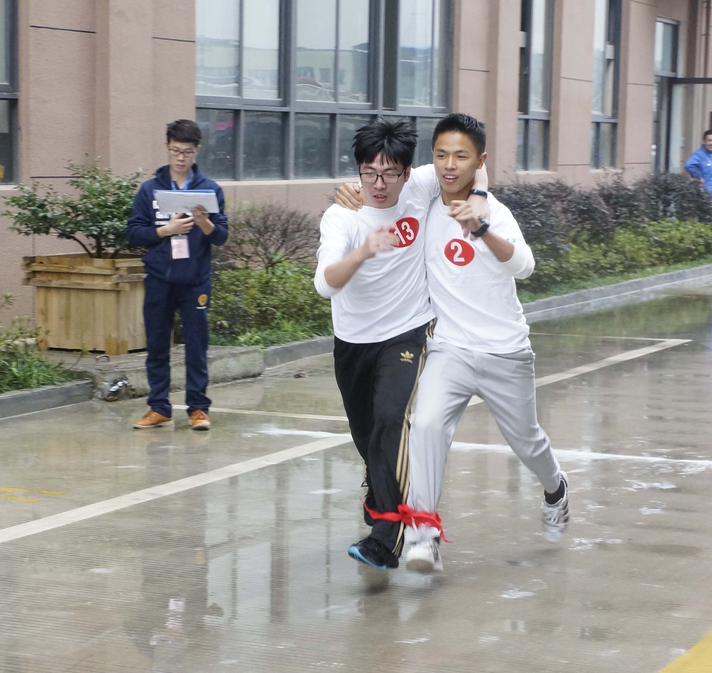 繞八字跳繩比賽也同樣揪人心弦,天空下起雨,卻絲毫未削減參賽選手的激情,個個動作飛快,像在賽場上繞八字飛舞的一條長龍。雨水浸濕頭發和衣服,場地遍地水洼,隊員們在水洼里“啪嗒啪嗒”的跳躍,竭盡全力拼搏,最后由線路板部和清分機部為代表的第七隊獲得該項第一。