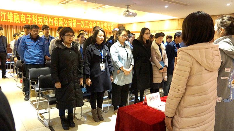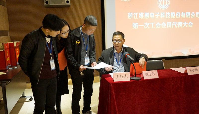 大會在雄壯的《中華人民共和國國歌》聲中隆重開幕。主持人宣讀了浙江蒼南工業園區總工會有關批復文件,工會籌備組代表李秩明作籌備工作報告,通過了第一次工會會員代表大會選舉辦法。會議依照《工會法》、《中國工會章程》采取差額選舉的辦法,經過公平、公正、公開的無記名投票,選舉李秩明、蔡增弟、魏舜軍、楊素葉、張欽樂、陳宣總、魏小蘭為維融科技股份有限公司第一屆工會委員會委員,魏舜軍、倪麗義、陳登婕為工會經審委委員,蔡增弟、馬長虹、羅玲為女職委委員;隨后召開的維融股份第一屆工會委員會、工會經費審查委員會、女職工委員會會議中選舉李秩明同志為工會主席、蔡增弟同志為副主席;選舉魏舜軍同志為經費審查委員會主任、蔡增弟同志為女職工委員會主任。